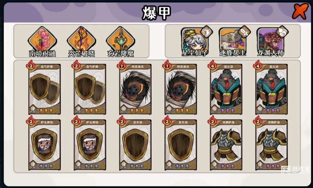 防御卡选择(8张土系):真气护体、护元神功、昆仑决、龙鳞护身。这些卡用于堆叠初始护甲,辅助回气操作。龙鳞护身提供冷血buff(100%暴击),在帮主开技能前务必提前挂上。